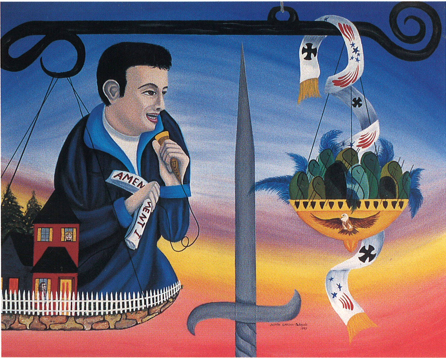 Fascinated by the quixotic entertainment world, many of Judith’s paintings pay homage to celebrities. “The Bruce Act” features the performing Lenny Bruce holding on to his first amendment right while staring at the scales of justice from behind a white picket fence.